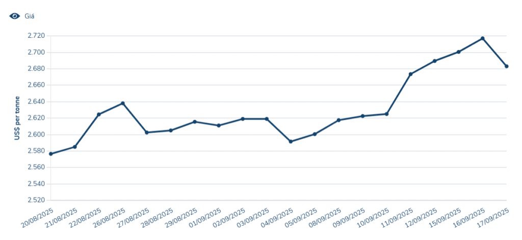 Aluminum prices on the London Metal Exchange (LME) closed at USD 2,689.5/ton on September 17, 2025, up USD 67.5/ton (0.31%) from the previous period and USD 167.5/ton (6.64%) year-on-year.